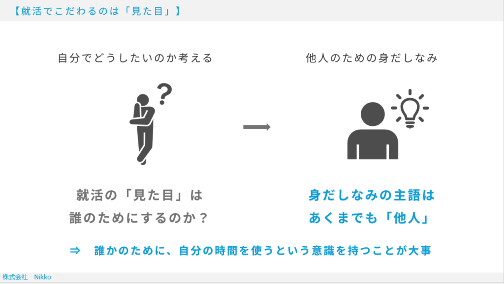 そもそも社会人における「身だしなみ」は、自分のためではなく他人のためと私は考えています。