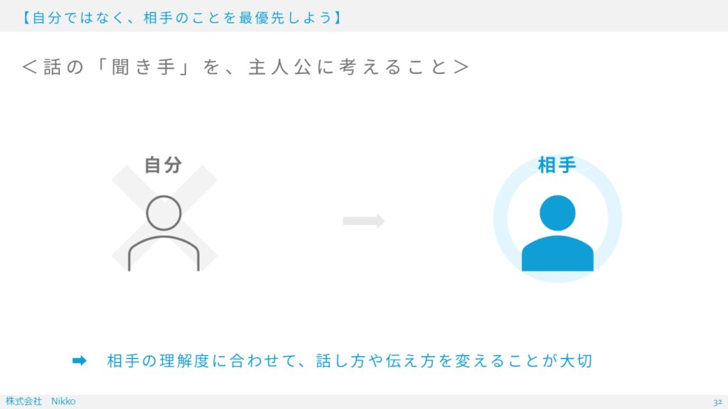 相手の理解や知識を考えて、自分が話す言葉を選ぶ必要があります。