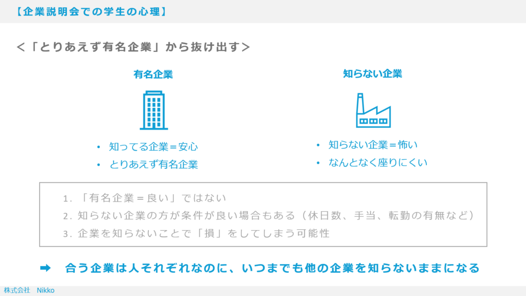 「みんな、名前だけで説明聞く企業決めてない?」ということ。